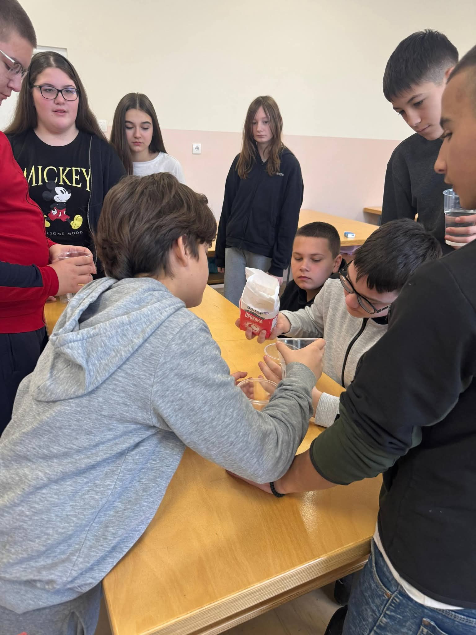 Ученици седмог разреда су на часу хемије правили засићене, незасићене и презасићене растворе уз помоћ шећера и воде.