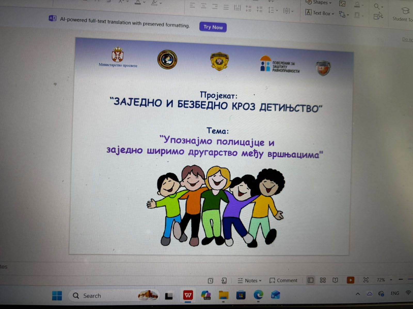 Циљ предавања је упознавање ученика са улогом и значајем полиције у заједници, као и развијање позитивних међувршњачких односа. Ученици су се кроз прилагођен садржај упознали са основним задацима полицијских службеника , правилима безбедног понашања, као и значајем међусобног поштовања, толеранције и сарадње. Посебна пажња је посвећена подстицању другарства, ненасилне комуникације и одговорног понашања у школском окружењу.